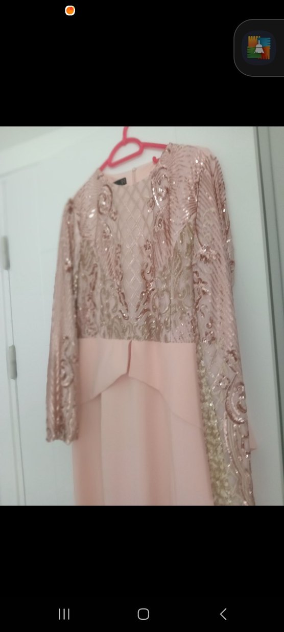 somon renkte, dantel işlemeli uzun kollu abiye elbise. balık kesime sahip, düğün ve özel davetler için uygundur. duruşu gayet güzel. tek sorunu bir kısmında tülerme oldu.