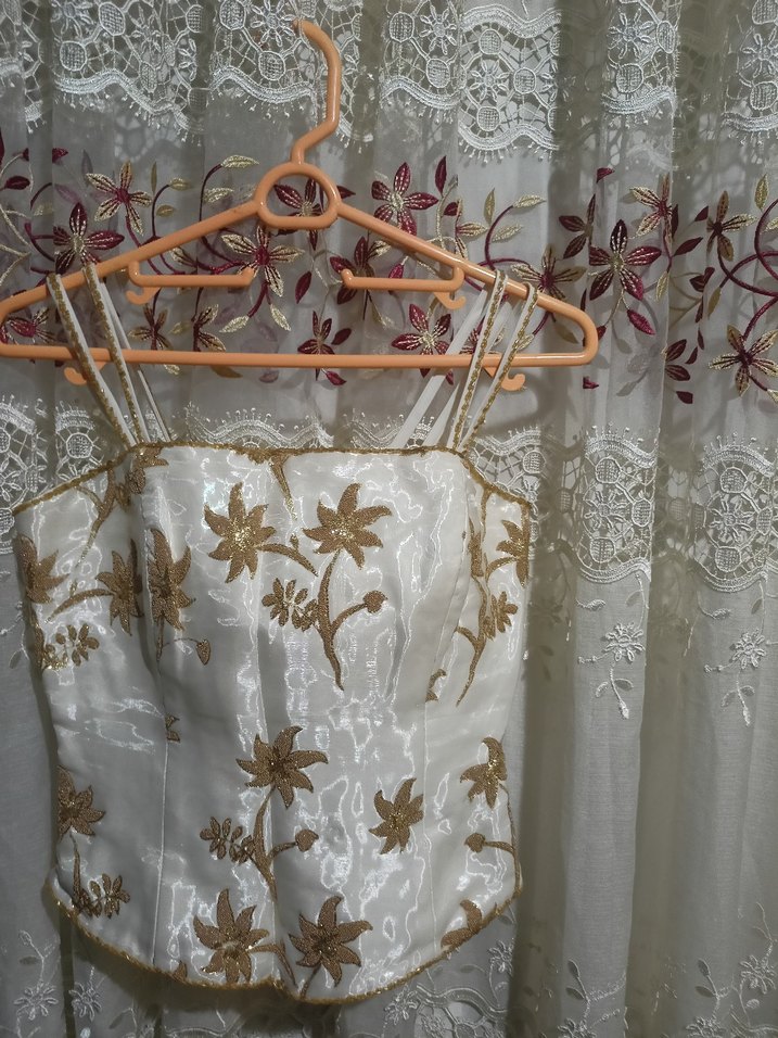 İşlemeli çiçek desenleri ve dantelli detaylara sahip, straplez ve vücuda oturan beyaz abiye elbise.