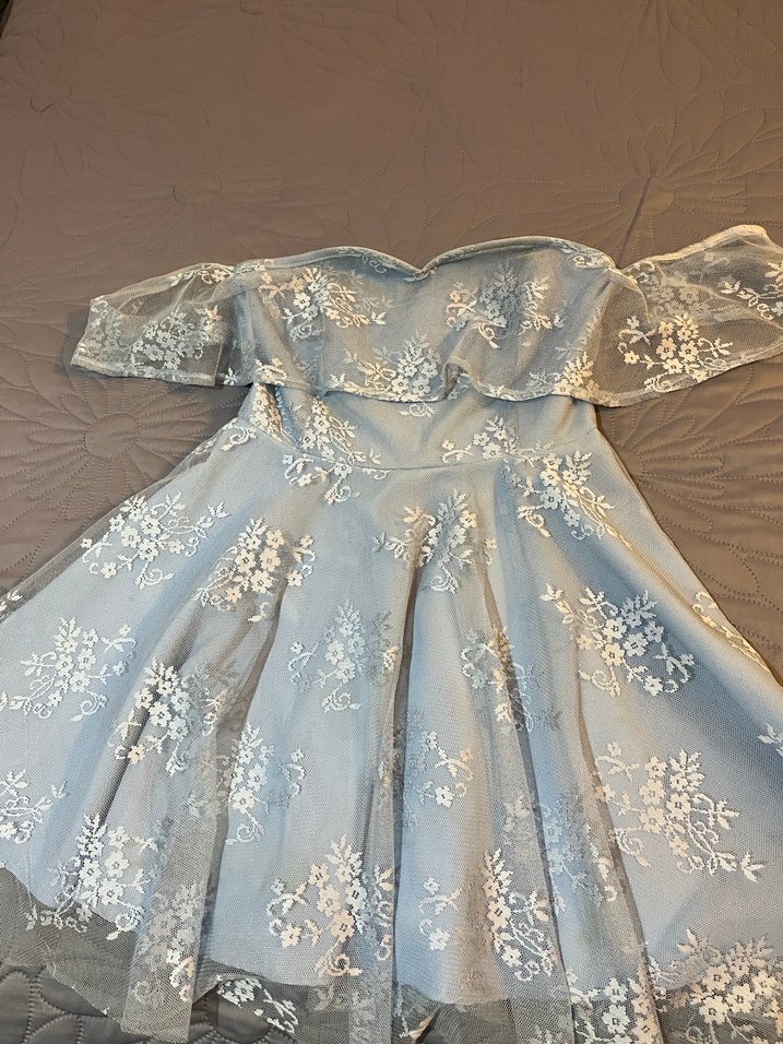 Dantel kısa kollu, işlemeli desenlere sahip mavi, straplez ve vücuda oturan abiye elbise, vintage bohem tarzda düğünler için uygun.