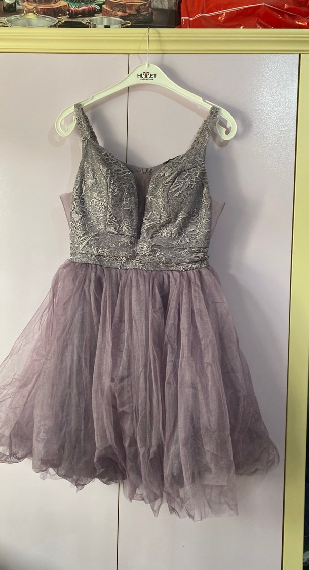 İşlemeli dantel üst ve yumuşak tül etekli, mor mini abiye elbise✨