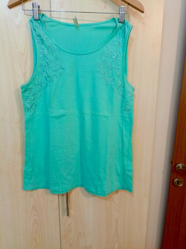 Yumuşak pamuk kumaştan, ön kısmı dantel işlemeli, turkuaz renkli, bol kesim kolsuz bluz. Günlük kullanıma uygundur.