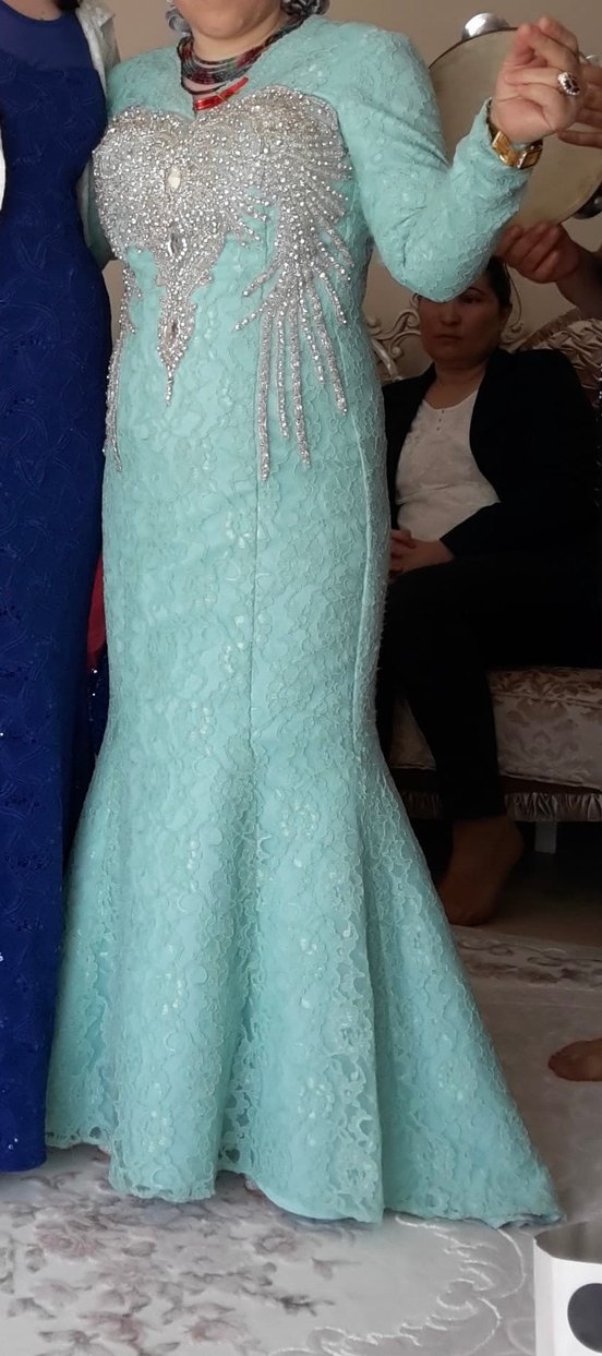 Bu dantel işlemeli turkuaz uzun abiye, straplez yaka ve parlak detaylarla klasik ve gösterişli bir duruş sunar.