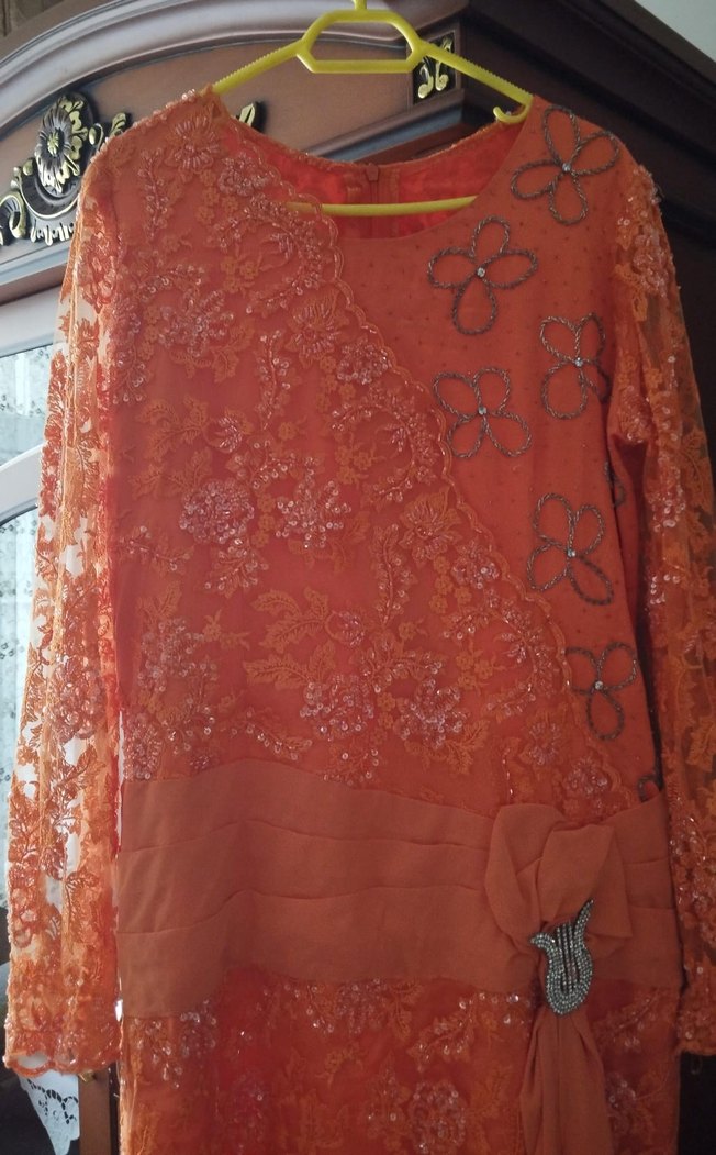 Dantel İşlemeli Turuncu Uzun Kadın Elbise