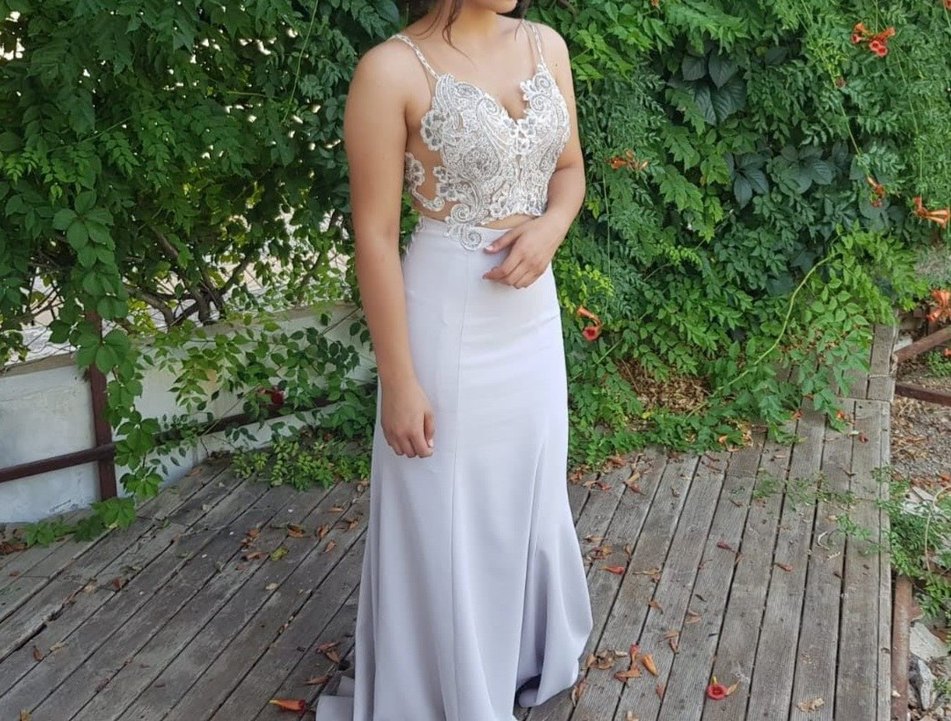 V yaka, dantelli işlemeli gövdesi ve uzun dökümlü eteği olan, dar kesim kolsuz gece elbisesi, düğünler için uygun.