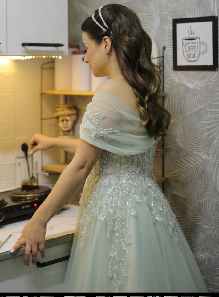 Klasik zarafette, straplez yakalı, kısa şeffaf kollu ve işlemeli detaylara sahip su yeşili, uzun ve vücuda oturan ve belden A kesim gelen prenses model nişan elbisesi. SADECE BİR KERE NİŞANIMDA GİYDİM. İÇERİSİNDE KENDİNİZİ PRENSES GİBİ HİSSEDİYORSUNUZ. ARKASI İPLİ OLDUĞU İÇİN BEDENİ AYARLANABİLİYOR. BEN RAHAT YÜRÜMEK İÇİN TEK KATLI TARLATANLA KULLANDIM. TARLATANI DA HEDİYE GÖNDERİCEM. HEPSİ SAPASAĞLAM