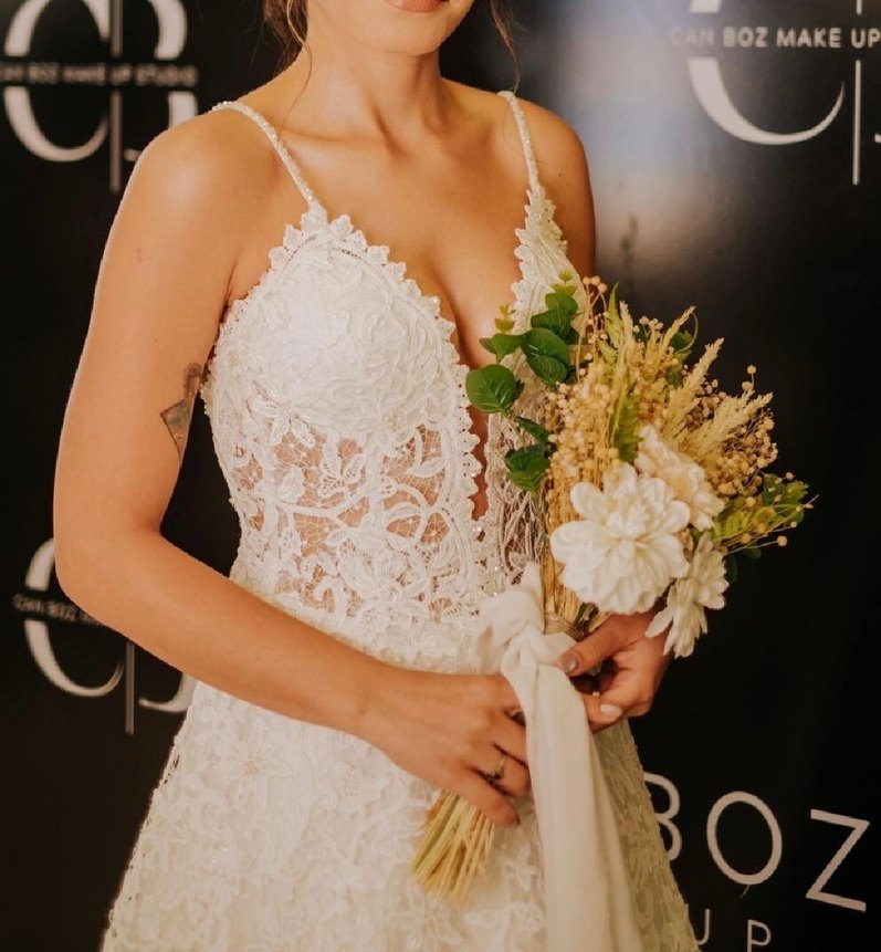 Kuru temizlemesi yeni yapıldı. Direkt alıp giymeye uygun. 2 adet duvağı var. Biri 2-2,5 metre diğeri kısa . Çiçeği hediye edilecek. Özel dikim . 34-38 beden arasında ayarlanabilir.İnce askılı, V yakalı ve dantel işleme detaylı, bohem tarzda, klasik zarafette beyaz gelinlik. Bebeğim olduğu ve ona oda yaptığımız için yer açmak amaçlı satıyorum .