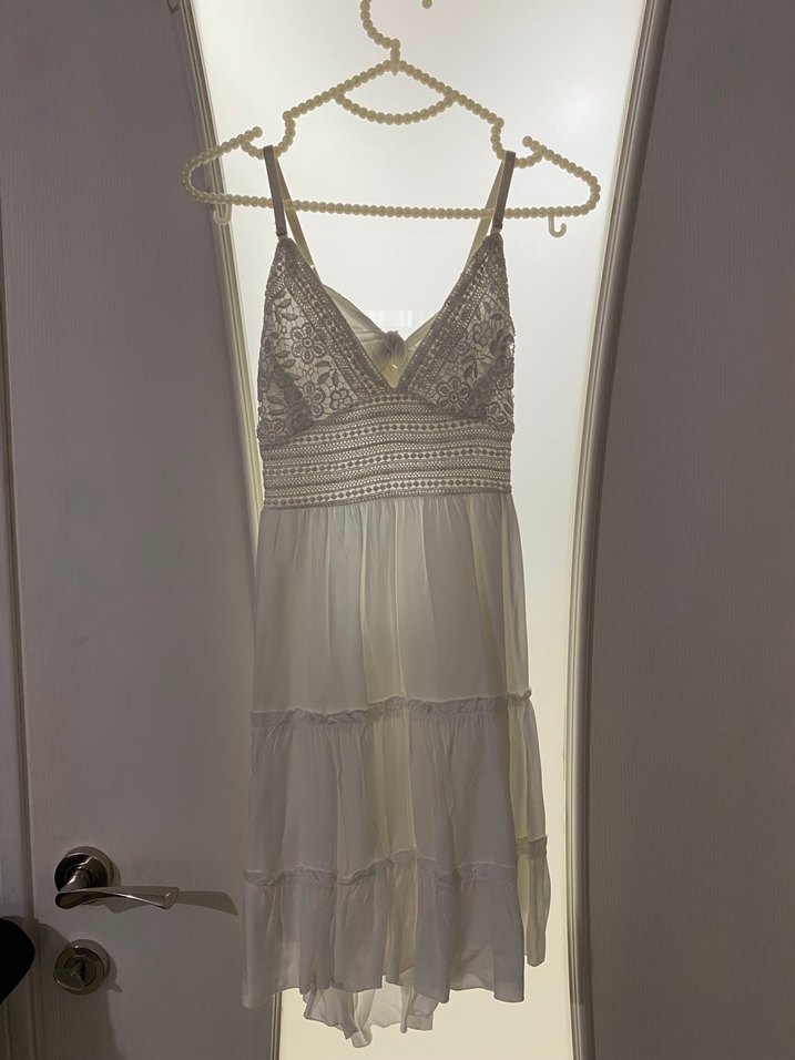 Beyaz renkli bu bohem mini elbise, dantel ve işlemeli detaylara sahip, V yaka ve ince askılıdır. Düğünler için ve yazlık yerlere uygundur.