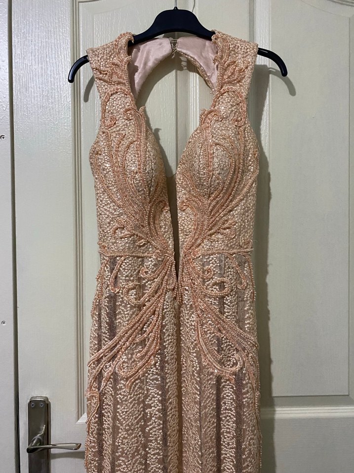 V yakalı, dantel işlemeli, uzun ve kolsuz bu dar kesim abiye elbise, pudra renginde olup şık düğünler için uygundur.