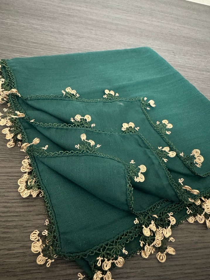 Yeşil tekstilden, parlak dantel işlemeli kenarlarıyla bohem tarzda kadın şal.