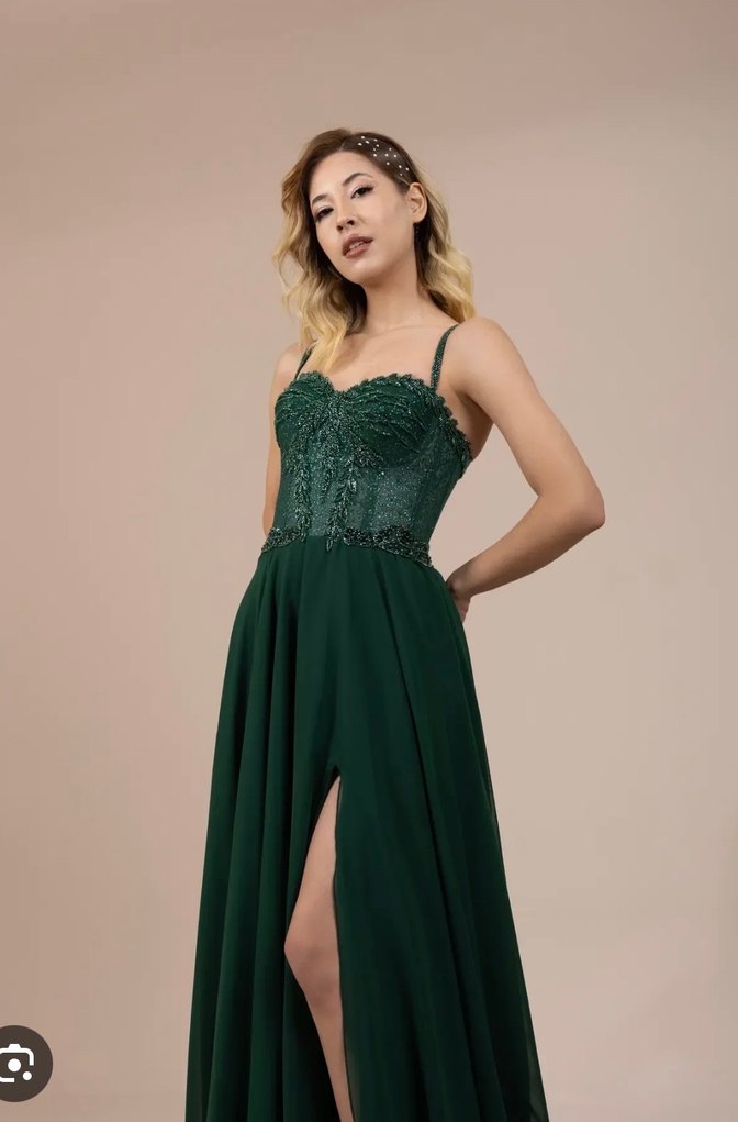 Dantel işlemeli straplez üst ve ince askılı kollara sahip, fitted kesim uzun abiye elbise. Koyu yeşil renk ve yan yırtmaç modern klasik tarz sunar, parti için uygun. 1 kere giydim yırtmacı biraz kapattırdım isteyen geri açar.Ben elbiseyi straplez yaptırdım askılı değil.Kuru temizleme alıcıya ait