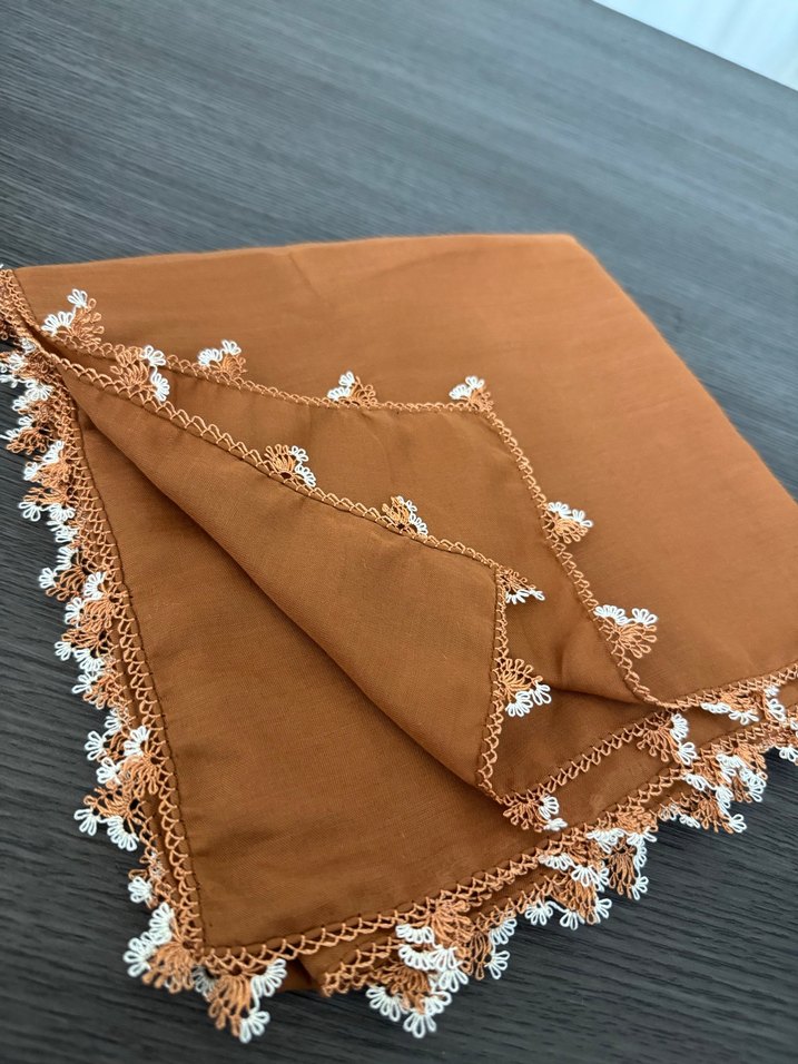 Bej renkli, dantel işlemeli kenarlara sahip tekstil fular. Parlak dokusu ve rahat, bohem tarzıyla retro ve hippie kombinlere uyum sağlar.