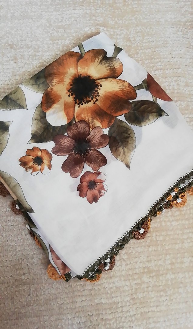 Beyaz tekstil kumaştan, koyu çiçek desenli ve dantel kenarlı bohem tarzda kadın fular. Retro ve hippie görünüme uygundur.