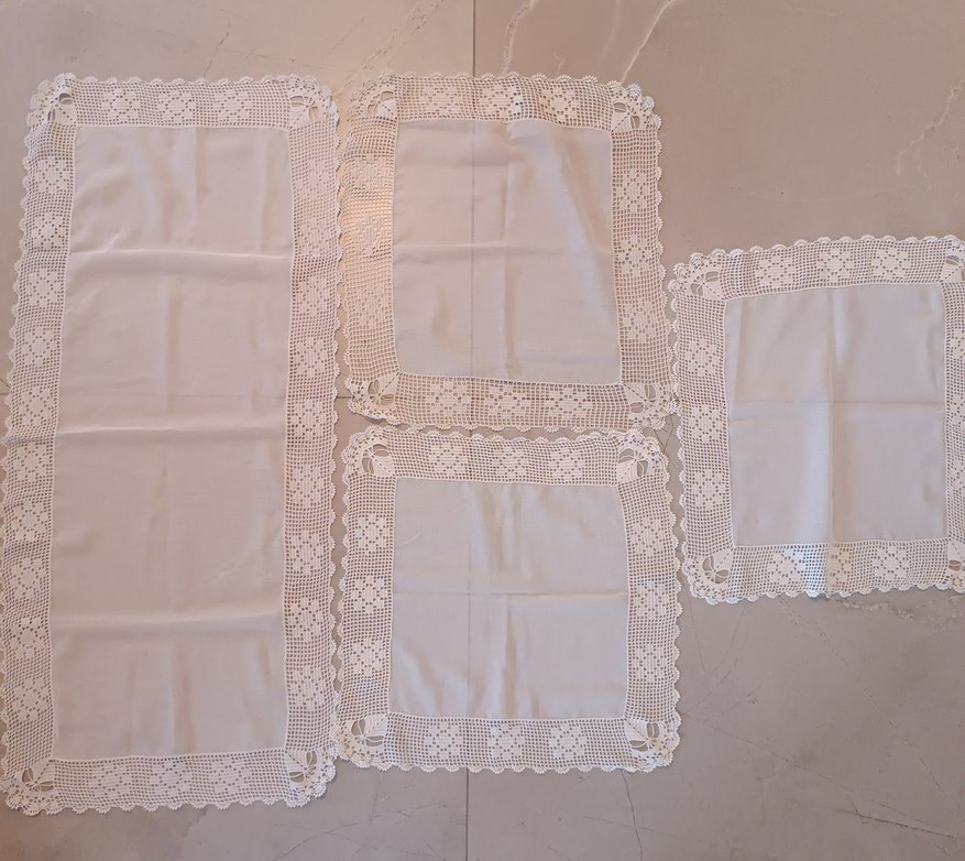 Dantel kenarlı beyaz kumaş seti, geleneksel el işi tarzında. Dekorunuza klasik bir dokunuş katar.