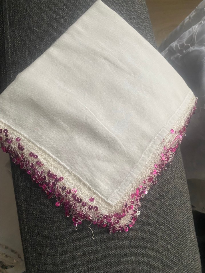 Beyaz tekstil fular, dantel kenarları ve parlak pembe detaylarıyla vintage bohem tarzını yansıtıyor. ✨