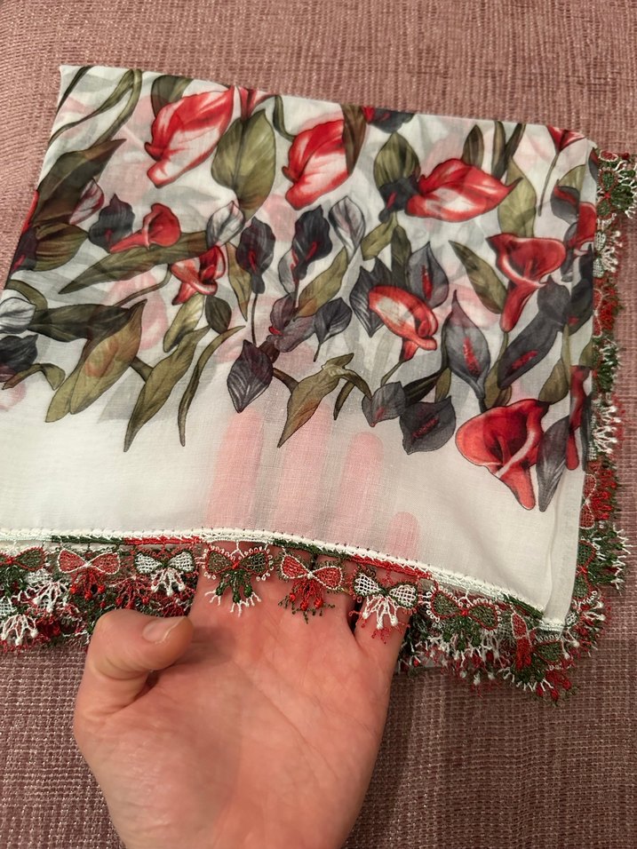 Kadınlar için bohem tarzda, çok renkli çiçek desenli tekstil fular, dantel kenar detaylıdır.