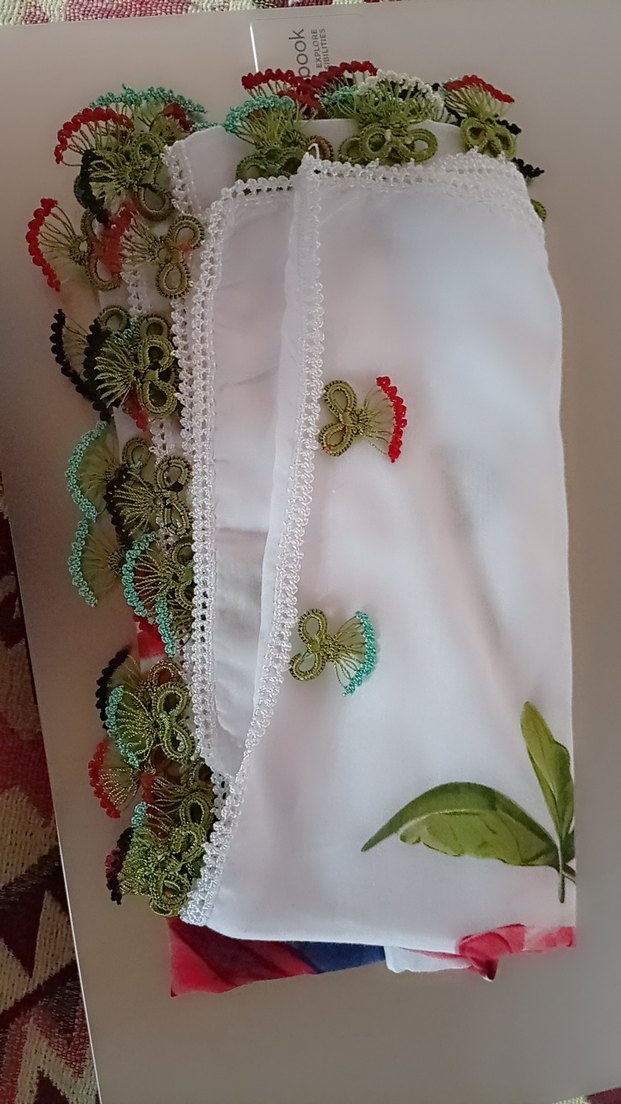 Kadın şalı, dantel kenarları ve çok renkli çiçek işlemeleriyle yumuşak tekstil kumaştan, bohem tarzını yansıtır.