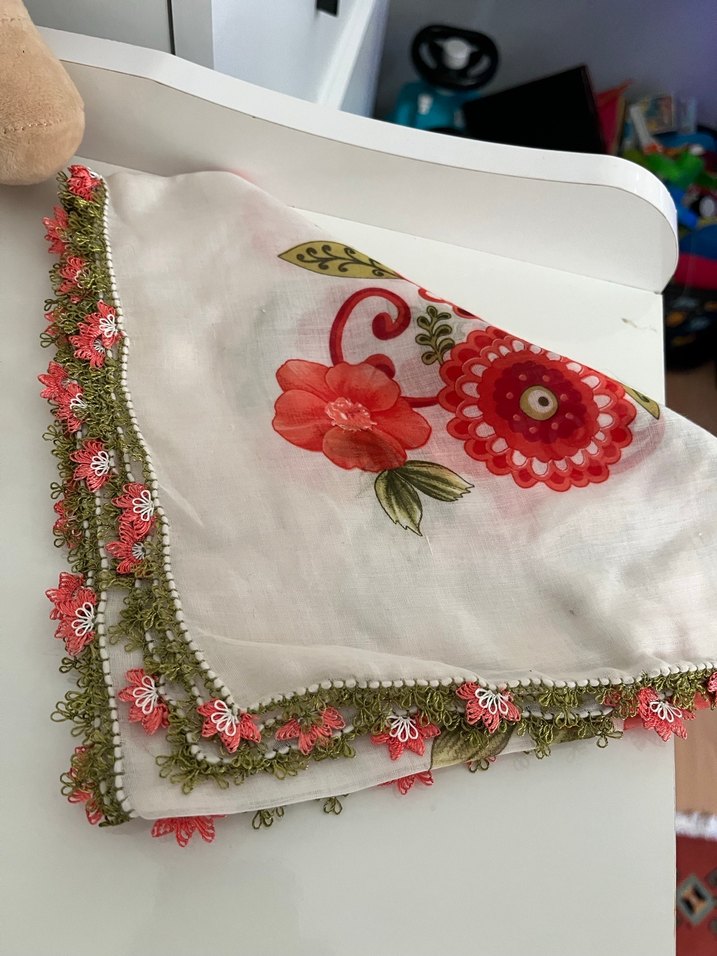 Çiçek desenli ve dantel kenarlı renkli kadın fuları, yumuşak tekstil malzemesinden üretilmiştir. Bohem, retro ve hippie tarzlarına uygundur.