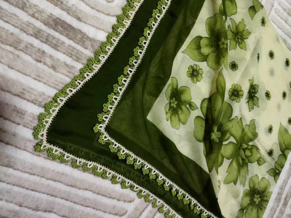 Yeşil renkli, dantel kenarlı ve çiçek desenli tekstil kadın fular. Bohem ve retro tarzıyla renkli detaylar sunar. tığ işi yazma yeni