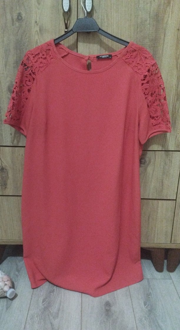 Pembe kadın tunik, kısa dantel kollu ve yuvarlak yakalıdır. Rahat kesim ve midi boyda, yumuşak sentetik kumaştan üretilmiştir. Günlük kullanım için uygundur.