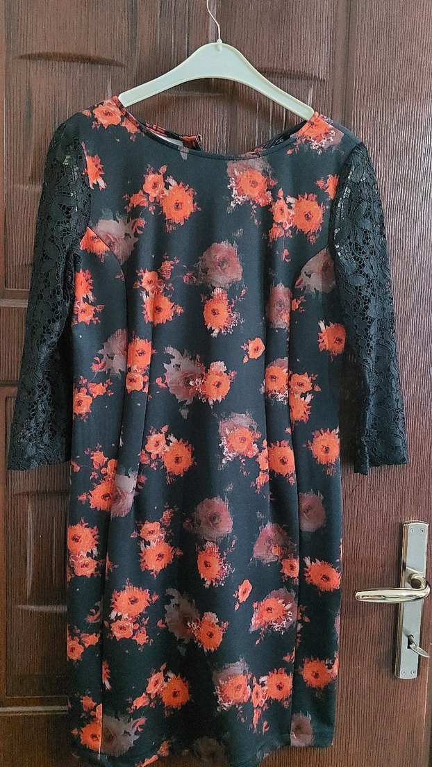 Dar kesim midi elbise, uzun dantel kollara ve koyu çiçek desenine sahip sentetik kumaştan vintage gotik ve bohem tarzı yansıtıyor. Romantik akşamlar için uygun.