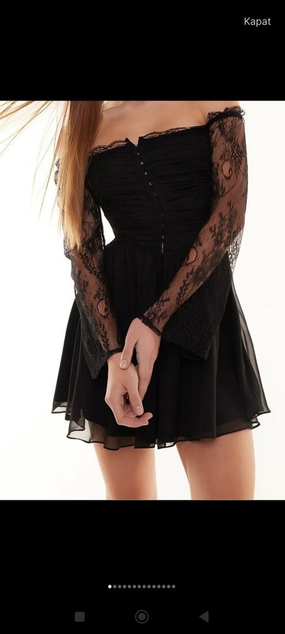 Siyah, dantelli uzun kollara ve straplez yaka detayına sahip, vücuda oturan bu gotik mini elbise, romantik akşamlar için uygun.