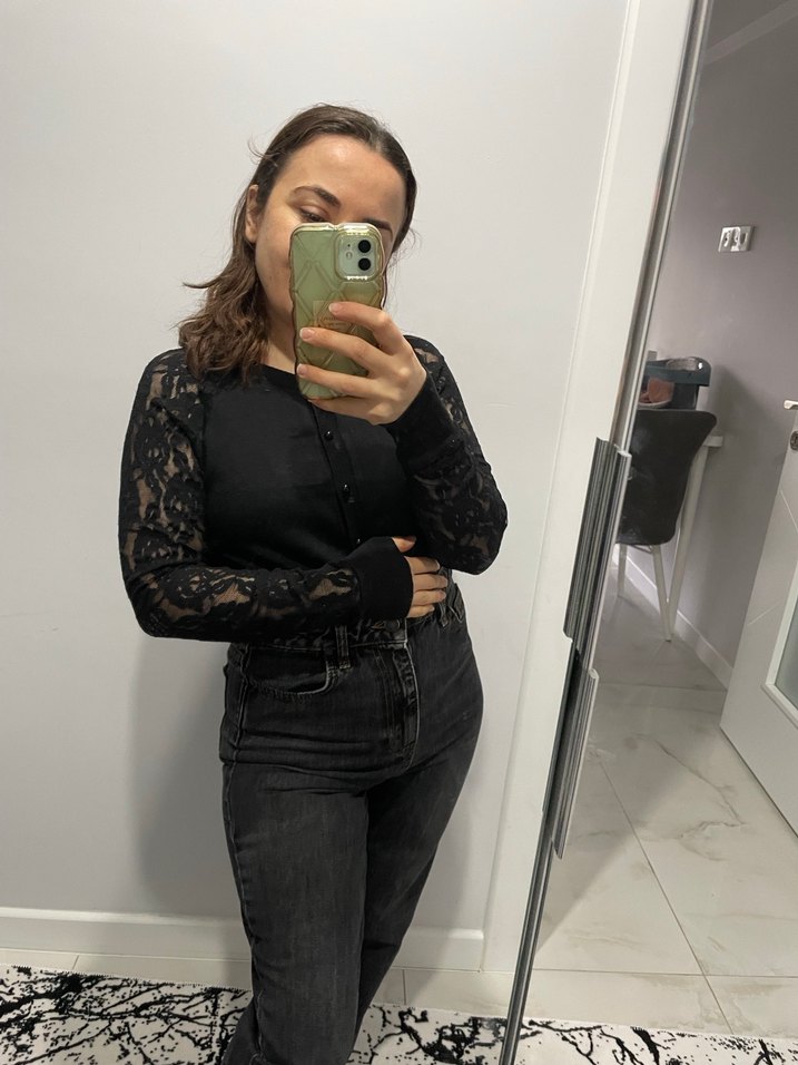 Bu siyah kadın hırka, uzun dantel kollara ve yuvarlak yakaya sahip, denim kumaştan yapılmıştır. Fitted midi boyu ve koyu renk desensiz tasarımı günlük kullanıma uygundur.