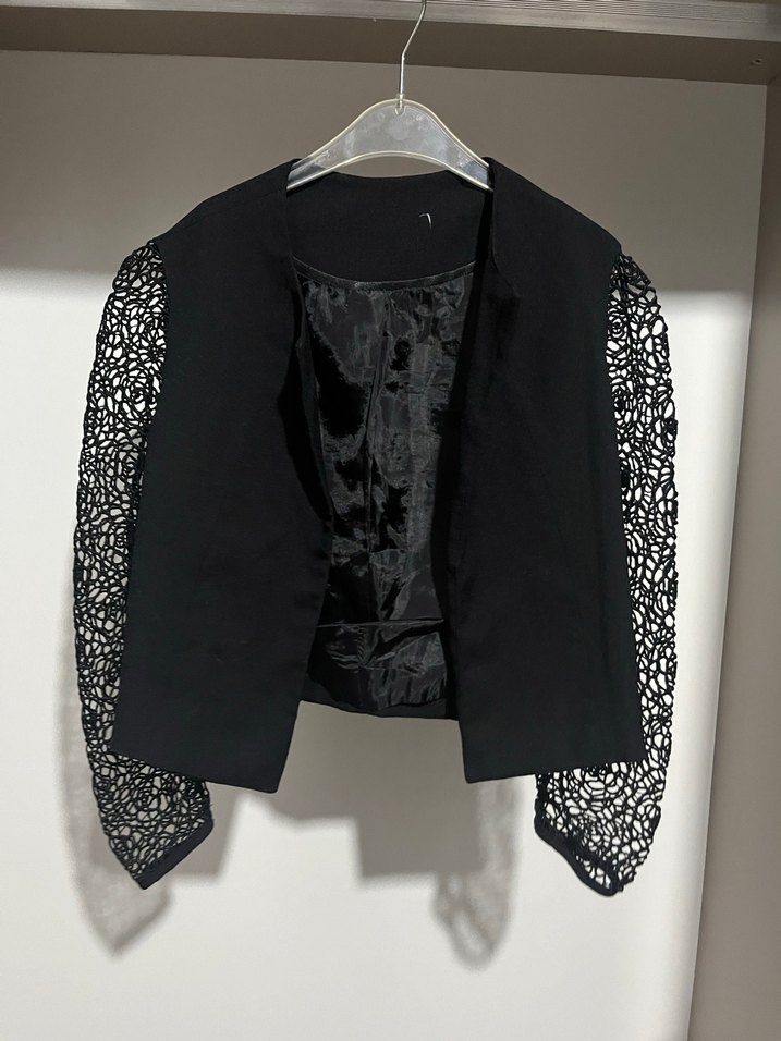 Dantel uzun kollu, kısa kesim ve sivri yaka detaylı siyah kadın blazer. Sentetik kumaştan yapılmış, gotik stile uygun şık bir ofis parçası.