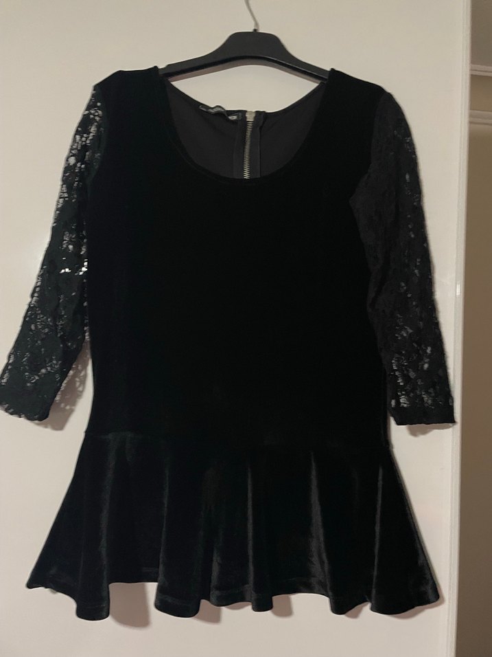Siyah süet, v yaka, dantel uzun kollu, oturan kesim midi uzunluğunda bluz. Hafif volanlı alt kısmı romantik akşamlar için uygun.
