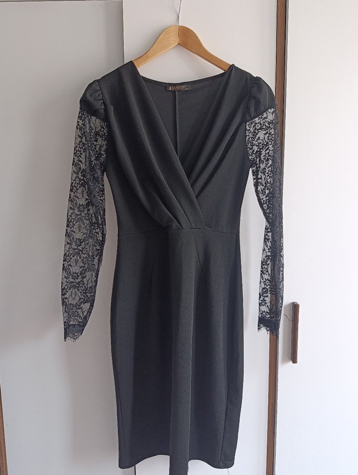 Bu siyah, v yaka ve uzun dantel kollu elbise, klasik gotik tarzıyla ofis için uygun, vücuda oturan uzun bir modeldir. ✨