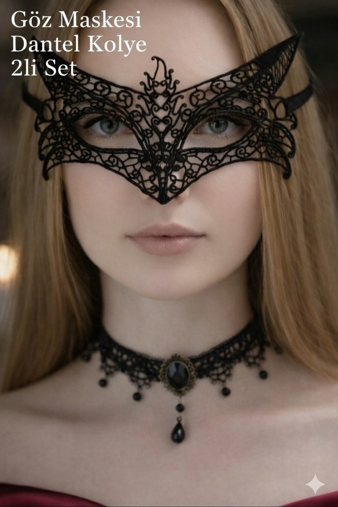 İnce detaylı siyah dantel kolye ve göz maskesi içeren 2'li set, gizemli bir görünüm sağlar.