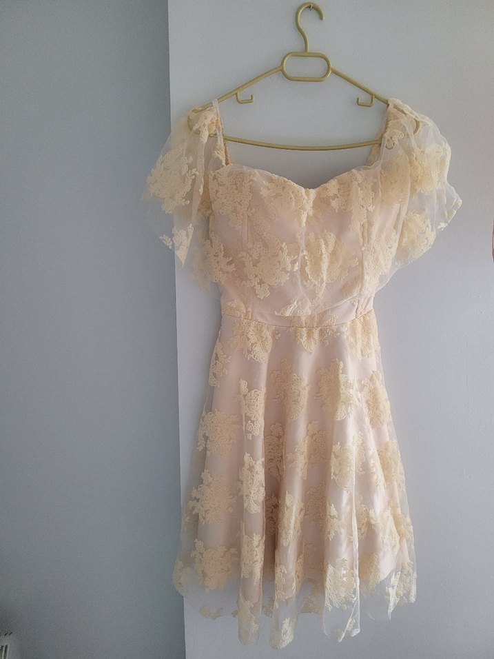 Somon renkli, straplez yaka ve ince askılı kolları olan, midi boy mini Elbise. Dantel detaylarıyla vintage ve bohem stil sunar, klasik zarafete uygundur. M bedendir. hiç bir sorunu yoktur.