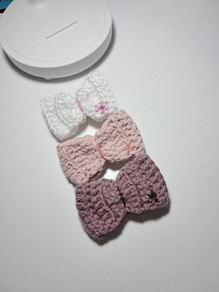 Beyaz, pembe ve mürdüm renklerde dantel ve nakış detaylı üç bohem tarzı bebek toka seti.
