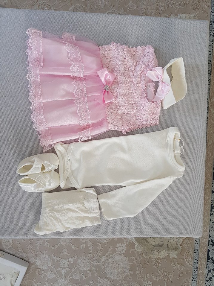 Dantel ve nakışlı kolsuz elbise Uzun Kollu Body, Saç Bandı, Ayakkabı. 5 parçadan oluşuyor 0-6 aylık