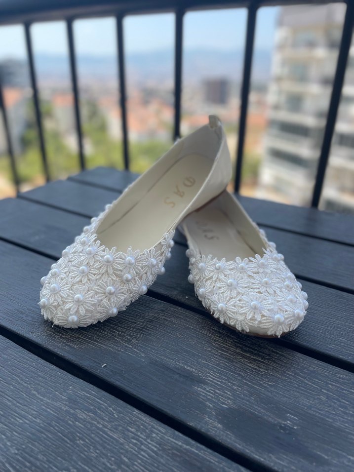 Beyaz renkli, dantel ve nakışlı çiçek desenine sahip, klasik tarzda kızlar için özel gün ayakkabısı. Kauçuk tabanlı, hafif ve şık tasarım.