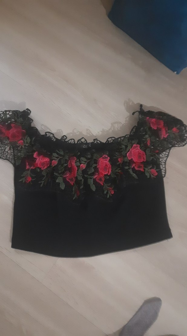 Dantel ve kırmızı nakış detaylı, tekne yaka, siyah mini, sentetik kumaştan, vücuda oturan bluz. Romantik akşamlar için uygundur.