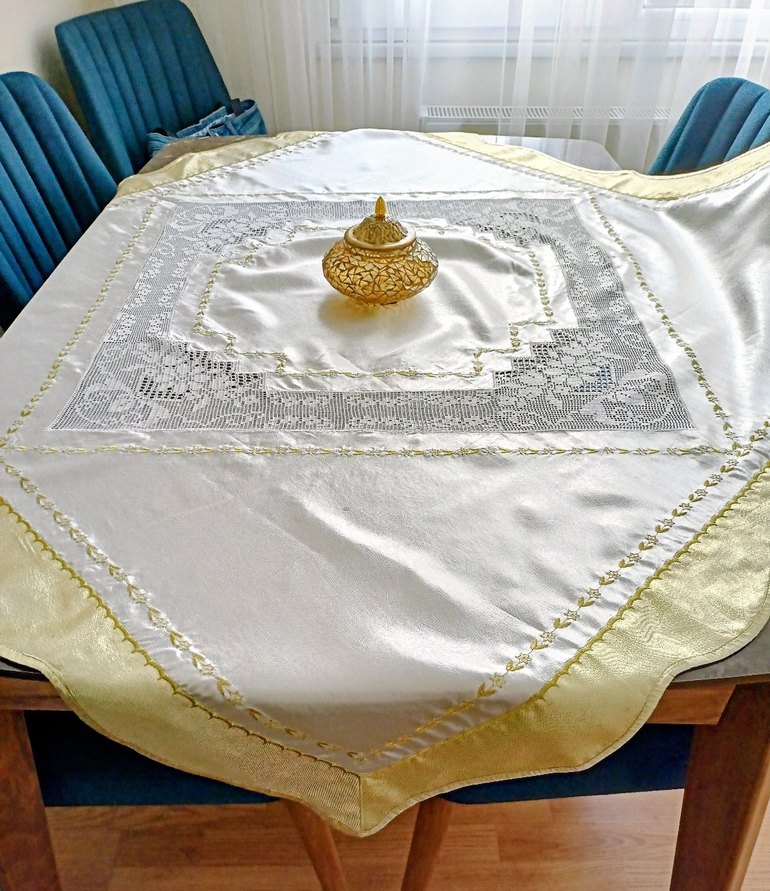 Nakışlı desenlere sahip beyaz parlak kumaştan yapılmış geleneksel masa örtüsü, sofranıza zarafet katar. ️ sorunsuz çok iyi durumda 110 x 110 cm #vintage #el işi #dantel