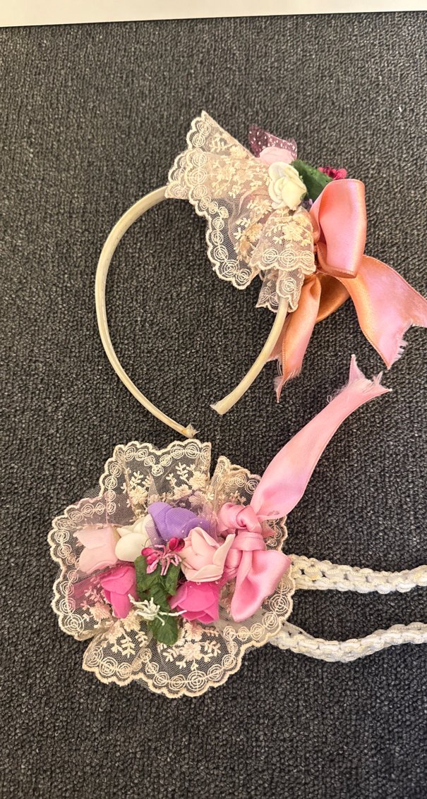 Pembe renkli çocuk saç bantları, dantel ve çiçek desenleriyle süslenmiş, bohem tarzda fiyonk ve zarif çiçek detayları içerir.