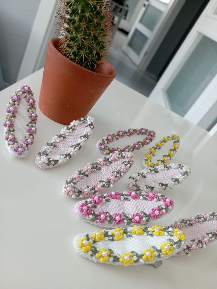 Dantel ve çiçek detaylarına sahip, pastel renkli bohem tarzda çocuk tokaları seti.
