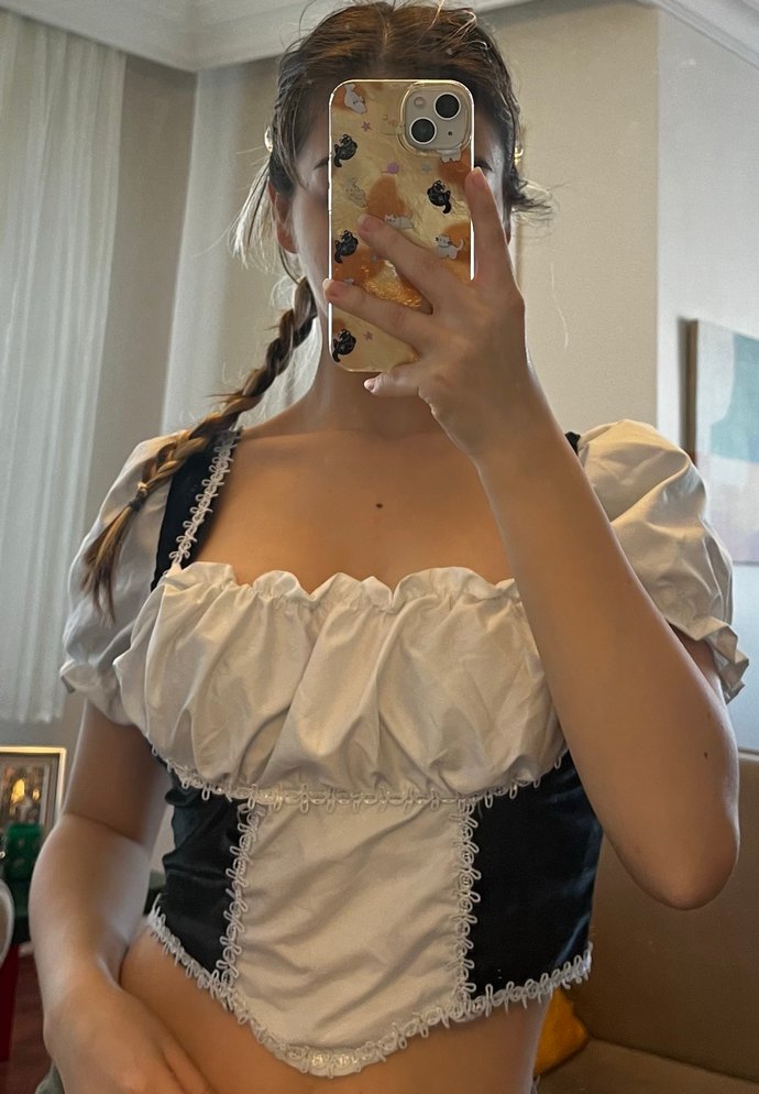 Arkası fermuarlı, bir kez giydim çekim için. Siyah kısımları kadife. Diğer kısımları satenimsi