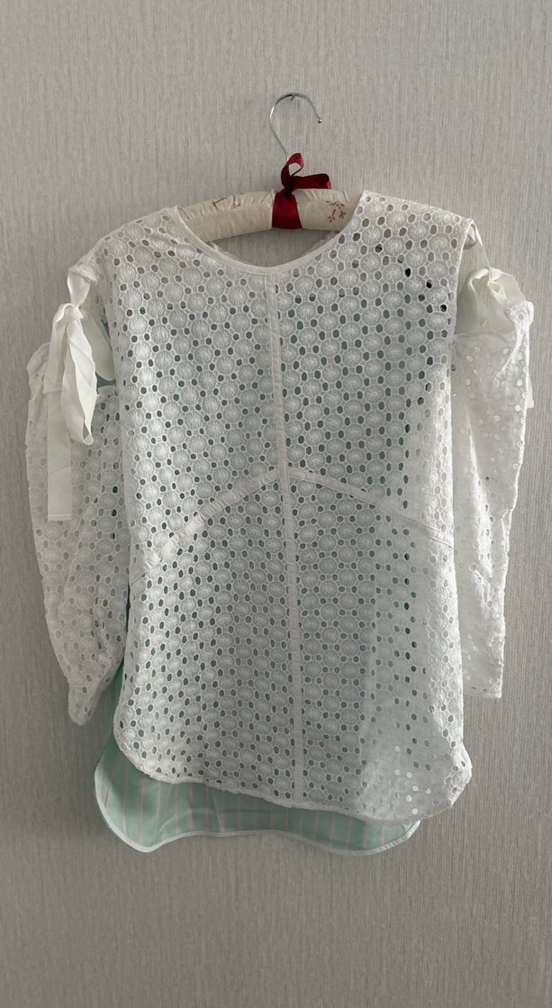 Uzun kollu, dantel ve nakış detaylı beyaz bohem tarzda bluz. Örgü kumaştan, salaş kesim ve yuvarlak yaka ile günlük kullanıma uygun.