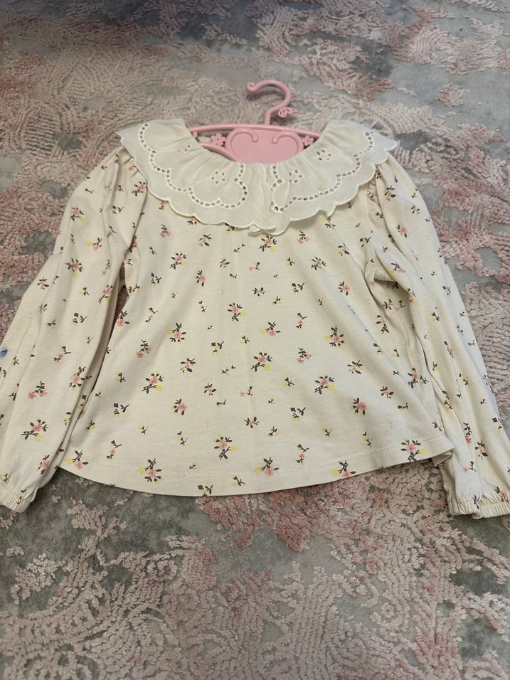 Uzun kollu, dantel yakalı, bol kesim beyaz kız bluzu. Yumuşak triko kumaştan, çiçek desenli ve bohem tarzda.