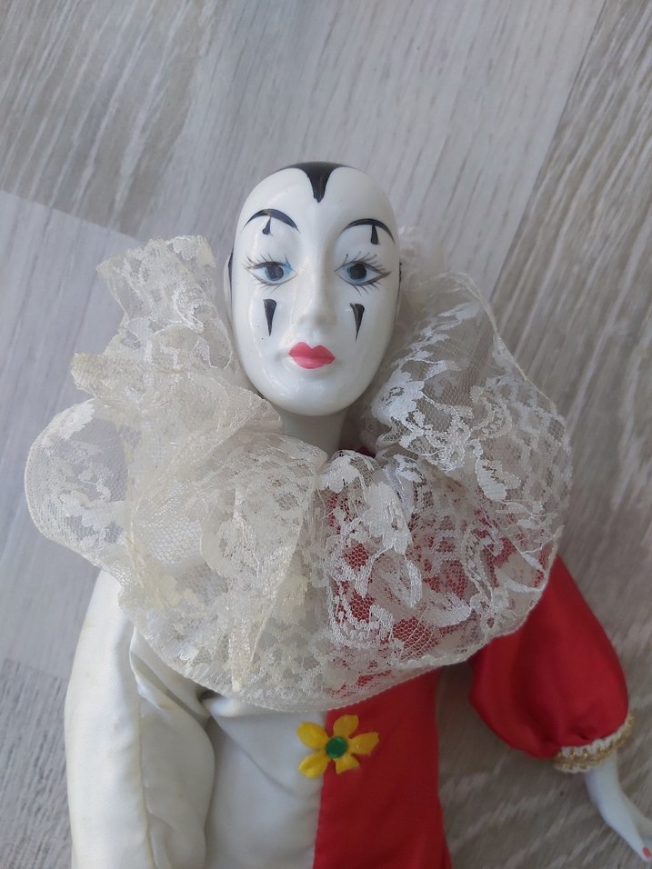 Dantel yaka ve boyalı yüz detaylarıyla beyaz ve gri renkte figürin. Klasik ve zarif tasarım unsurları içerir. Vintage Porselen Bebek #vintage #retro #porselenbebek