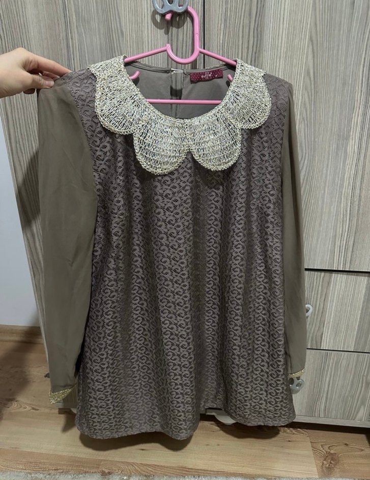 Dantel yakalı, uzun kollu, örme kumaştan yapılmış, bol kesim ve rahat bohem tarzda bej ve gri tonlarında kadın bluz.
