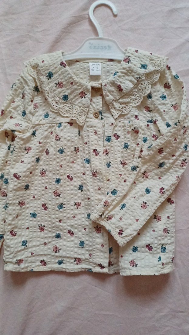 Yumuşak dokulu örme kumaştan, dantel yakalı ve nakışlı çiçek desenli, bol kesim uzun kollu beyaz kız gömleği.