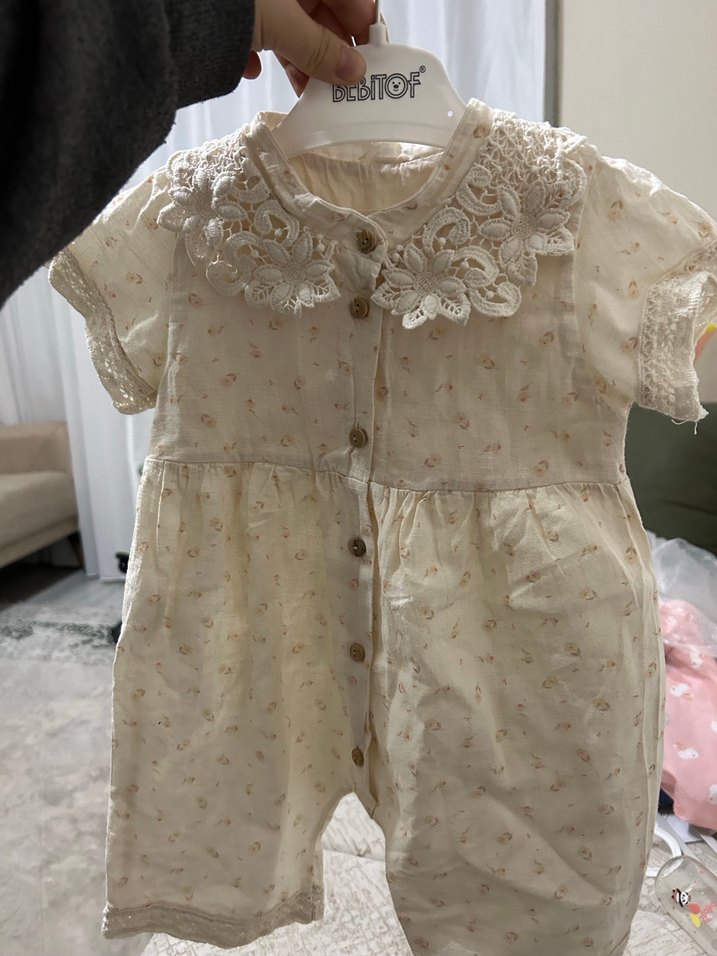 Dantel detaylı ve nakışlı beyaz bebek tulumu, kısa kollu ve düğmeli, yumuşak kumaştan üretilmiştir.