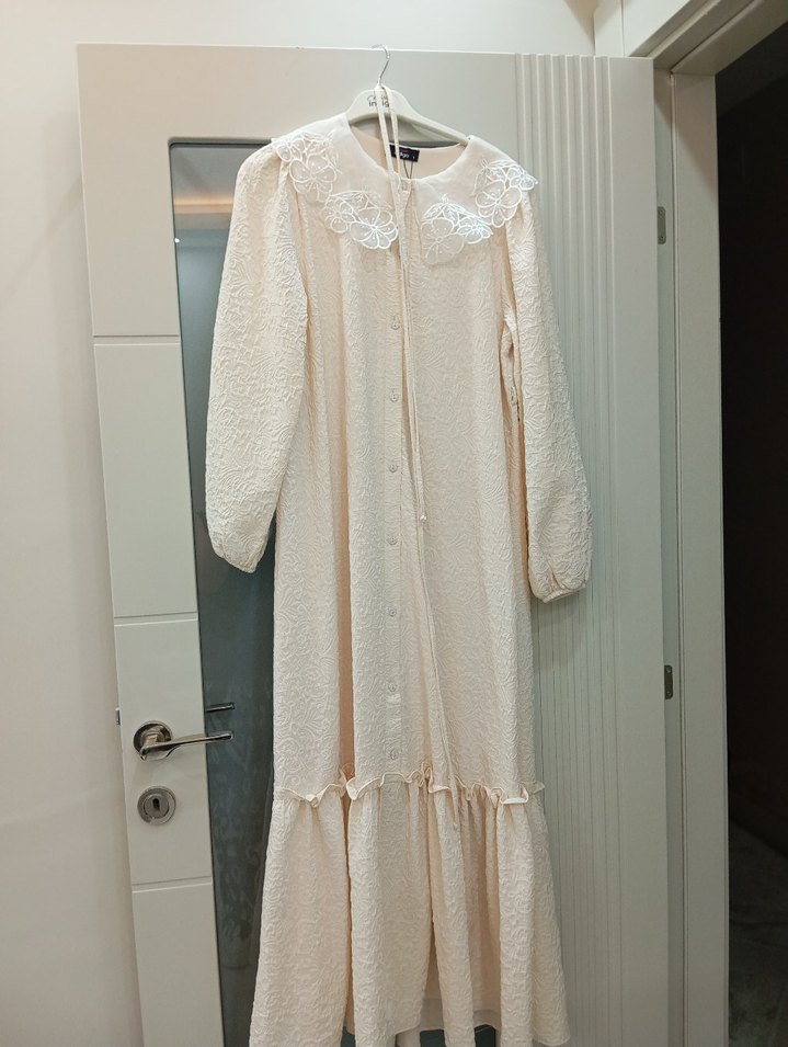 Dantel yakalı beyaz uzun keten elbise, bol kesim ve uzun kolludur. Nakışlı deseni ile bohem Paris tarzını yansıtır, klasik şıklık sunar.