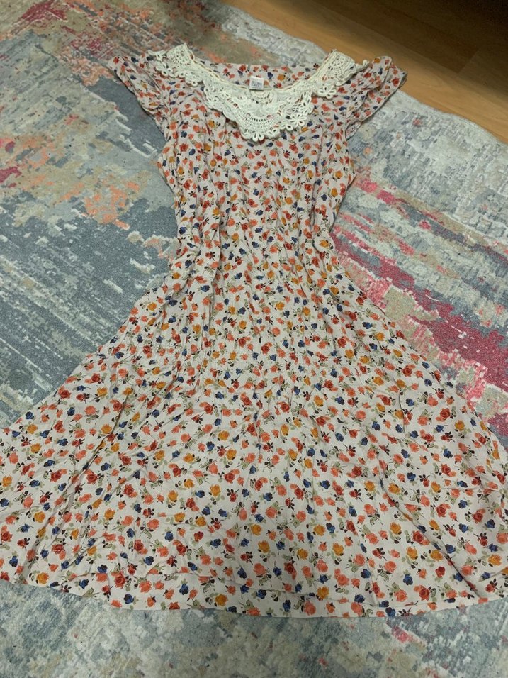 Dantel yakalı, V yaka, kısa kollu, çok renkli bohem midi elbise. Rahat kesimi ve desenli triko kumaşıyla günlük kullanıma uygundur.