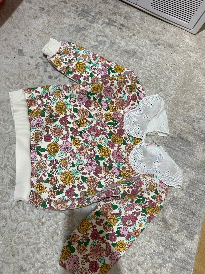 Dantel yakalı, nakışlı çiçek desenli, uzun kollu pastel renklerde bebek kız takımı.