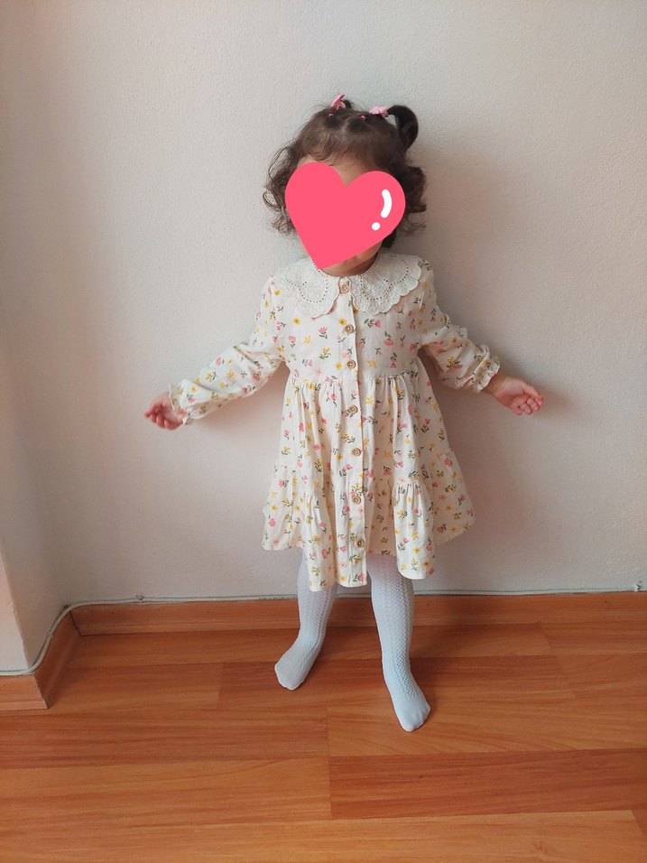 Pamuklu, pastel bej renkli, baskılı desenli, dantel yakalı ve uzun kollu bol kesim kız elbisesi. Bohem ve retro tarzda.