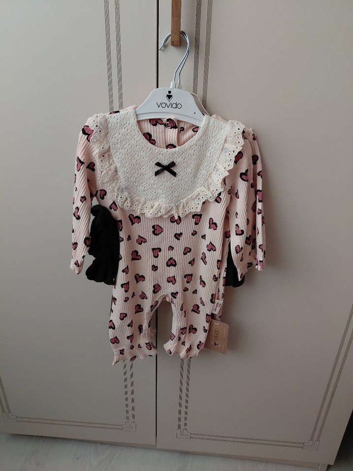 Dantel yakalı, küçük siyah fiyonk detaylı pembe baskılı tulum. Vovido markasına ait, pastel tonlarda şık bir bebek kıyafeti.